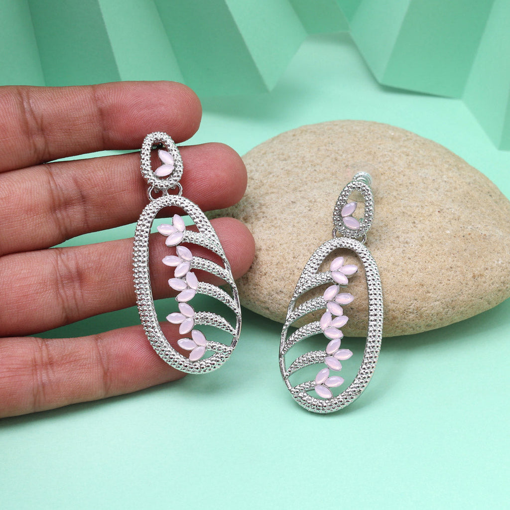 Earring Length: 6.00 CM x Width: 2.50 CM | Metal: Alloy With Good Quality Silver Plated | Color: Pink | Stone: Glass Stone | Gross Weight: 21.00 Grams | Package Content: 1 Pair Of Earring | Back Finding: Post With Friction Back x Earring Style: Dangle