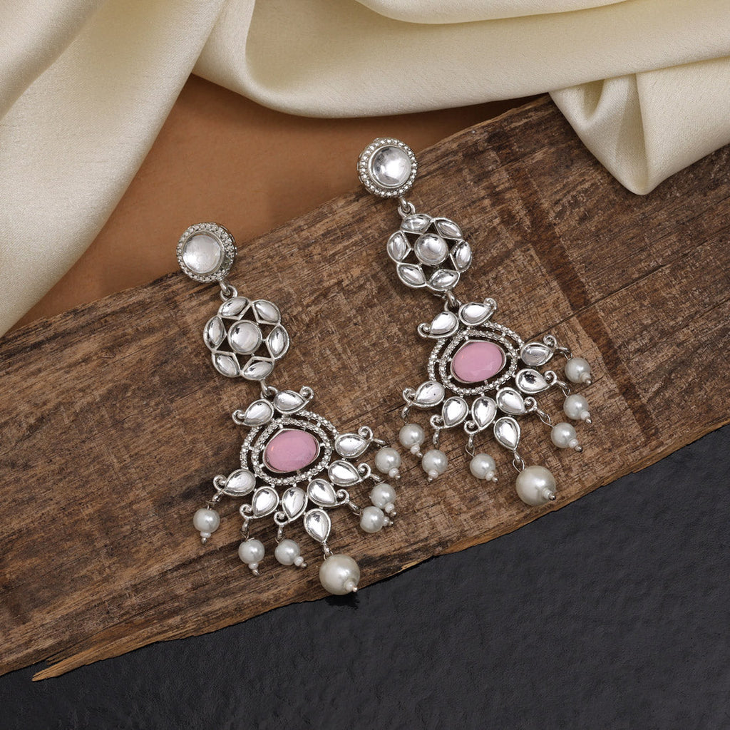 Earring Length: 7.50 CM x Width: 3.50 CM | Metal: Alloy With Good Quality Black Silver Plated | Color: Pink | Stone: Glass Stone | Gross Weight: 24.00 Grams | Package Content: 1 Pair Of Earring | Back Finding: Post With Friction Back x Earring Style: Dangle