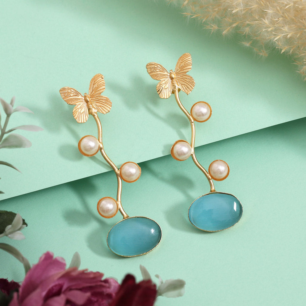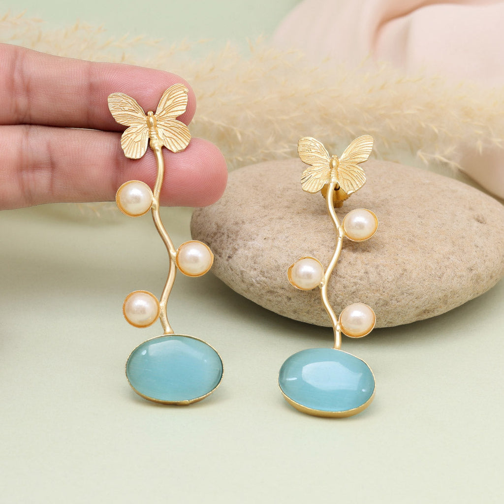 Earring Length: 7.00 CM x Width: 2.00 CM | Metal: Brass With Good Quality Gold Plated | Color: Sky Blue | Stone: Monalisa Stone | Gross Weight: 17.00 Grams | Package Content: 1 Pair Of Earrings | Back Finding: Post With Friction Back x Earring Style: Dangle